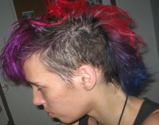 Quando achar que já passou o bastante, passe mais um pouco. É pra ficar melecado. É pra ficar exagerado. Coloque seu cabelo pra cima (não use bico de pato nem nada, apenas faça um coque - ou algo parecido - com o próprio cabelo e deixe que o grude da anilina segure ele pra você.) Tenha as luvas à mão (eu sempre fico com uma luva) para, se ele desmoronar, você poder colocá-lo de volta no lugar.